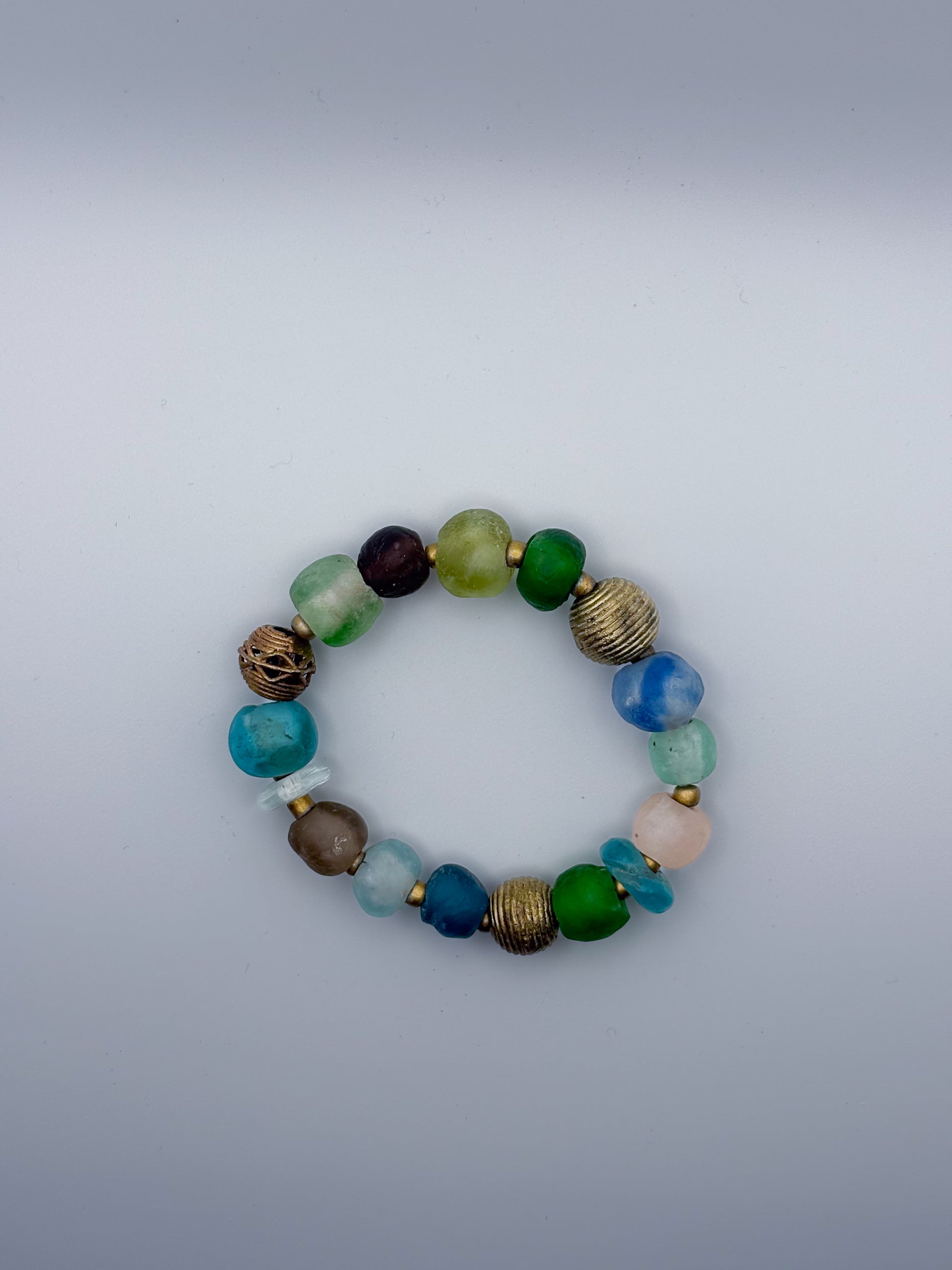 Handmade bracelet created with beautiful hand painted recycled glass and brass beads from Ghana.