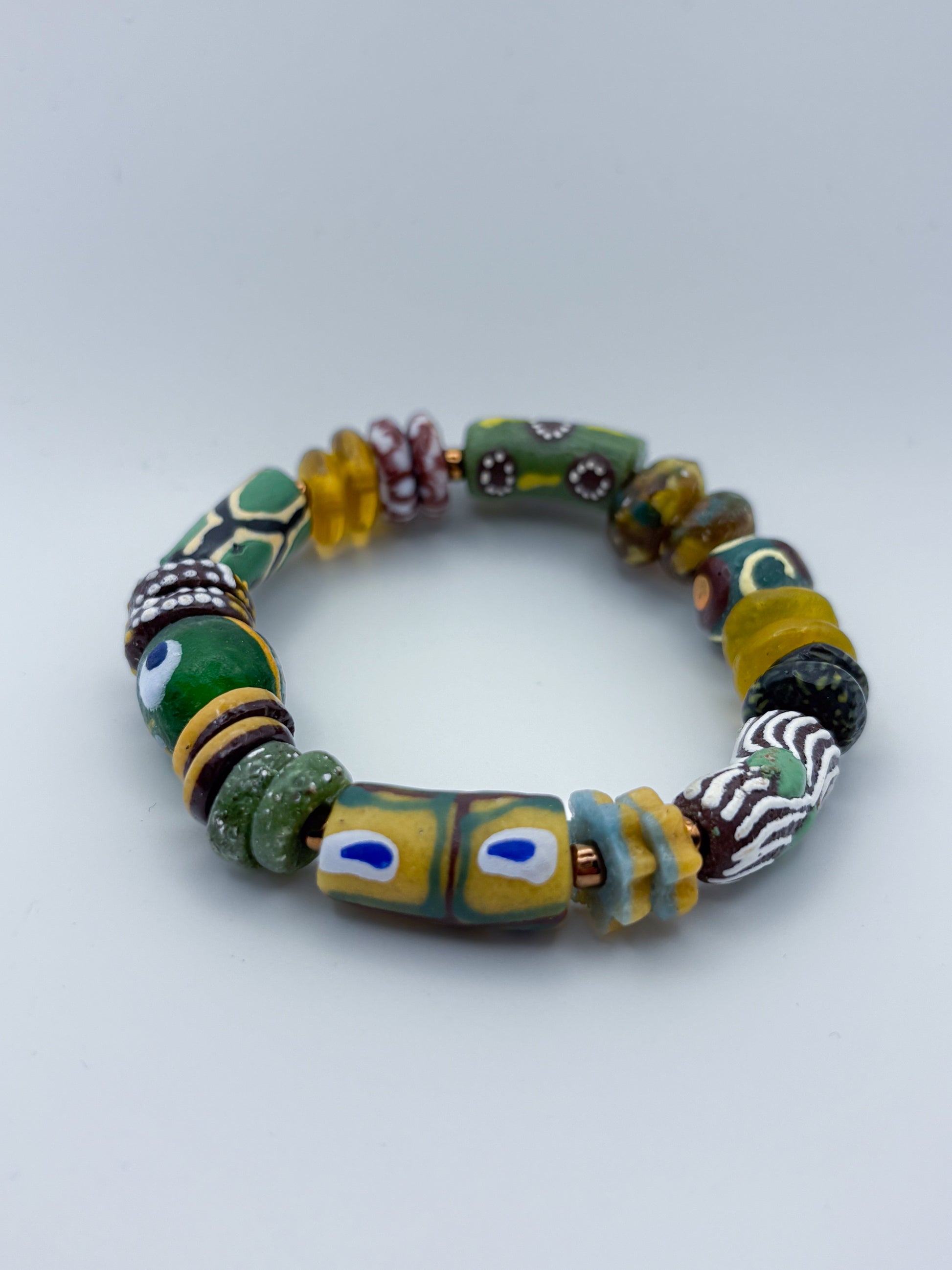 Handmade bracelet created with beautiful hand painted recycled glass beads from Ghana.