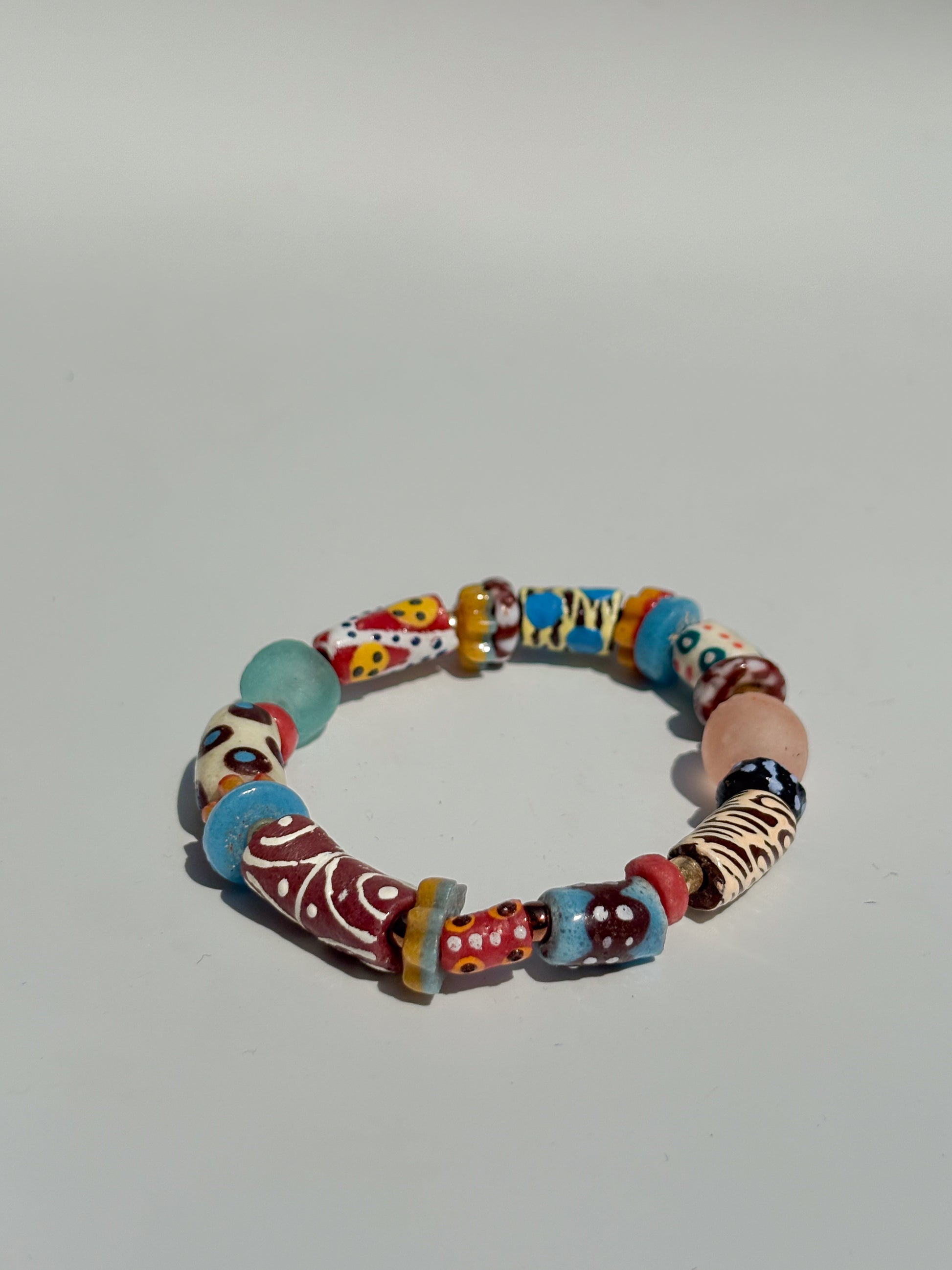 Handmade bracelet created with beautiful hand painted recycled glass and brass beads from Ghana.