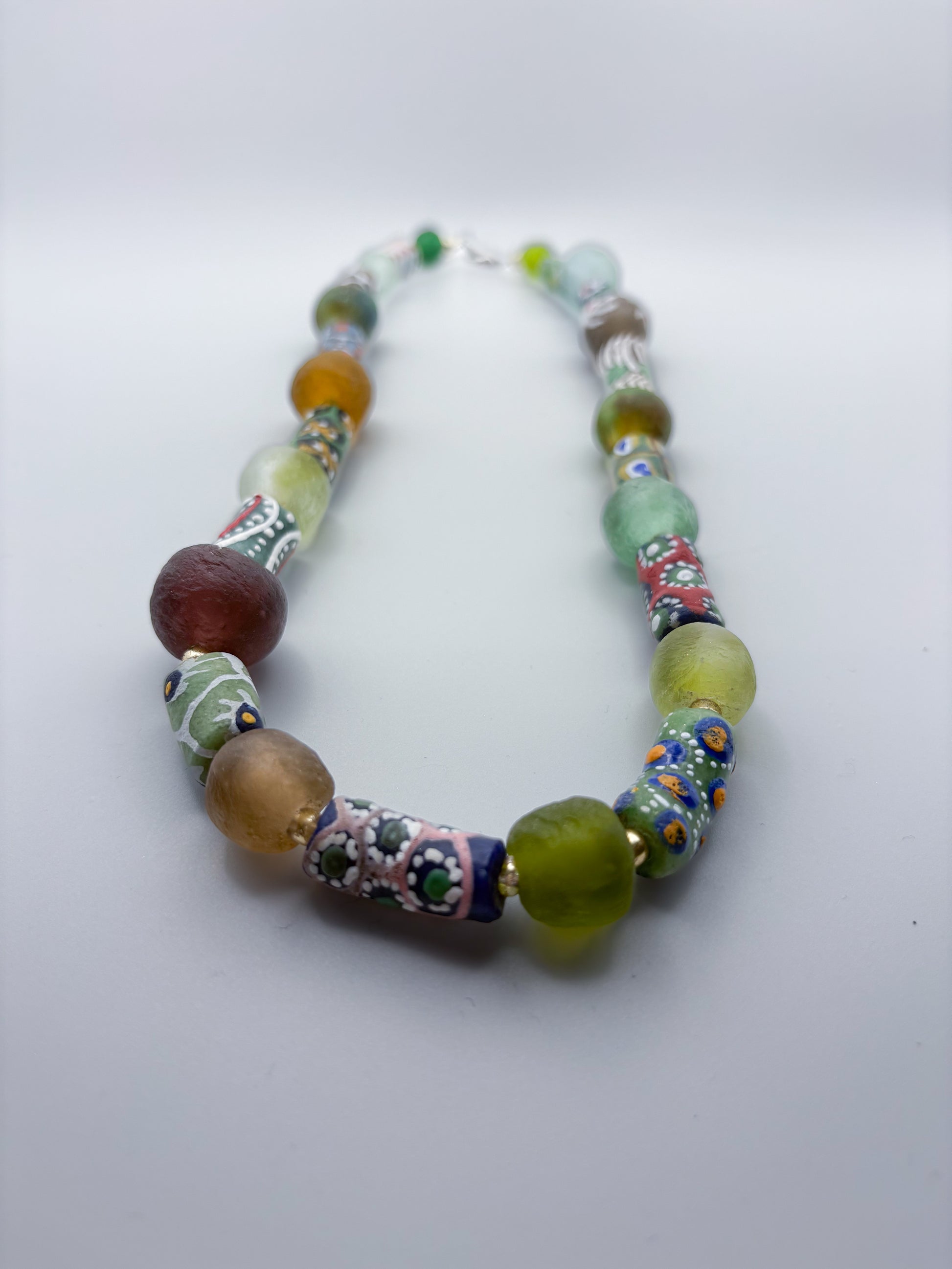 Handmade necklace created with beautiful hand painted recycled glass beads from Ghana.