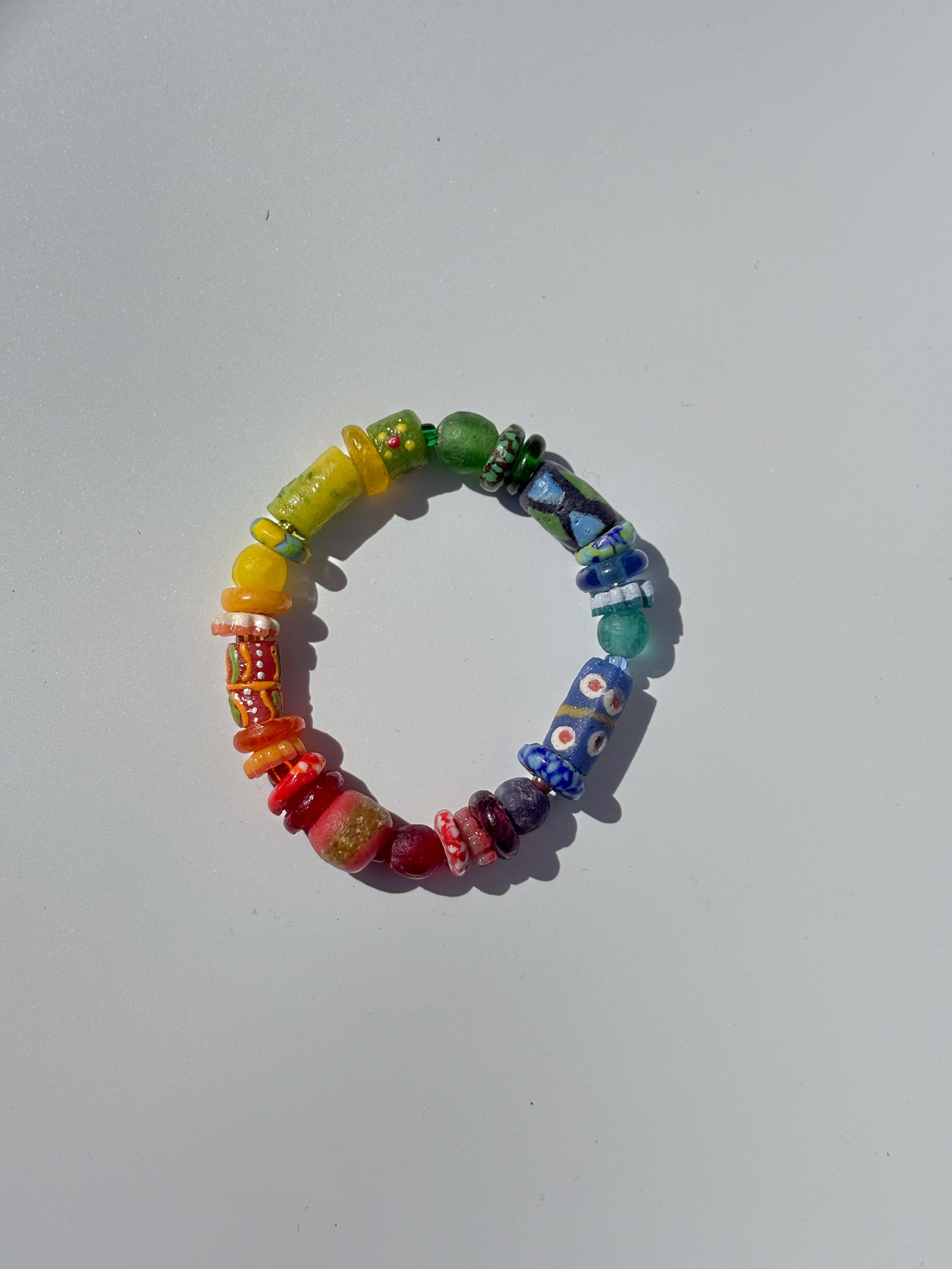 Handmade bracelet created with beautiful hand painted recycled glass and brass beads from Ghana.