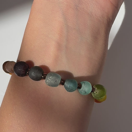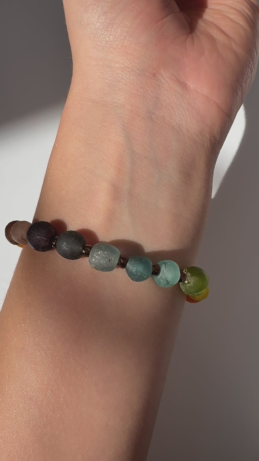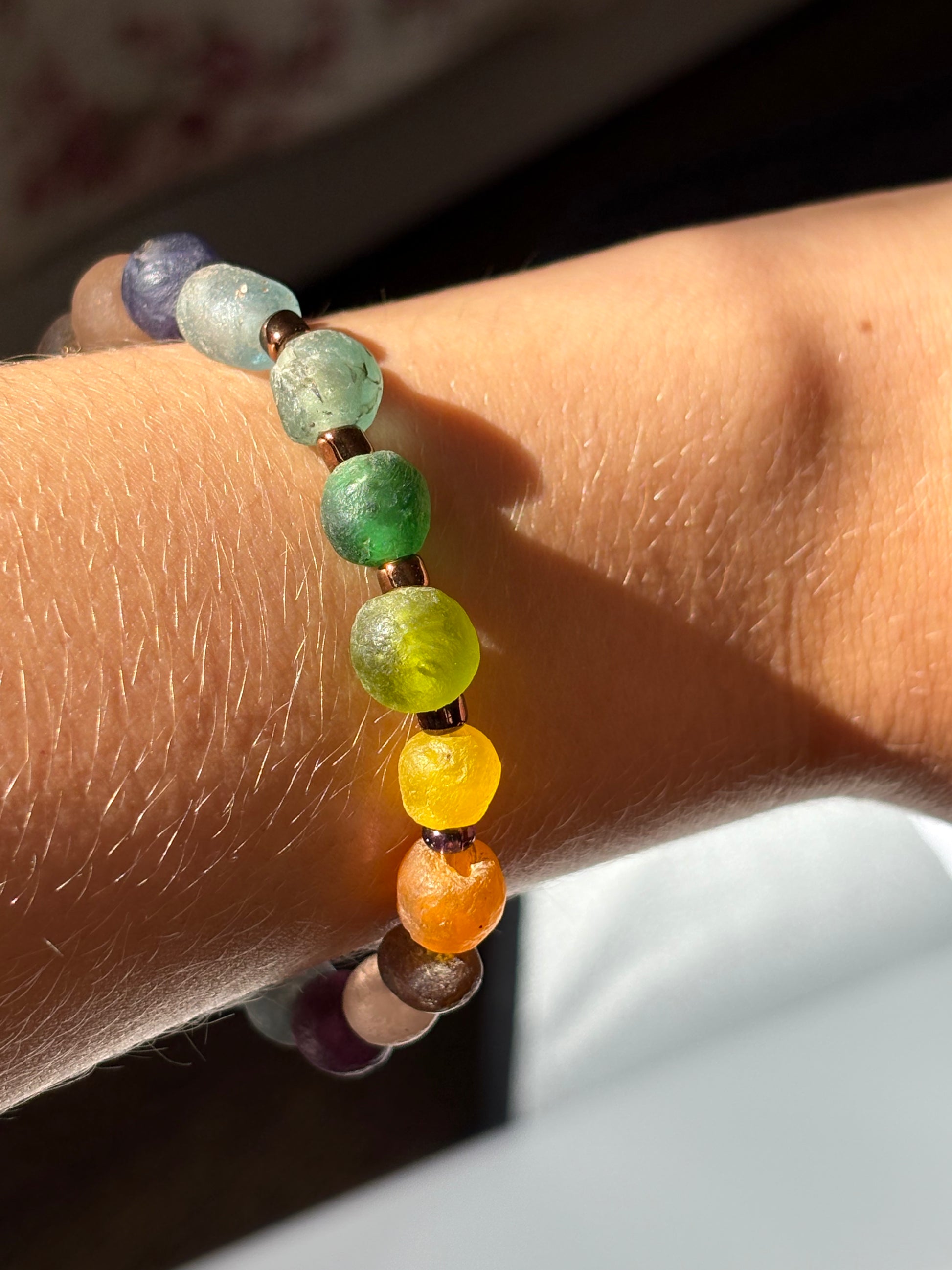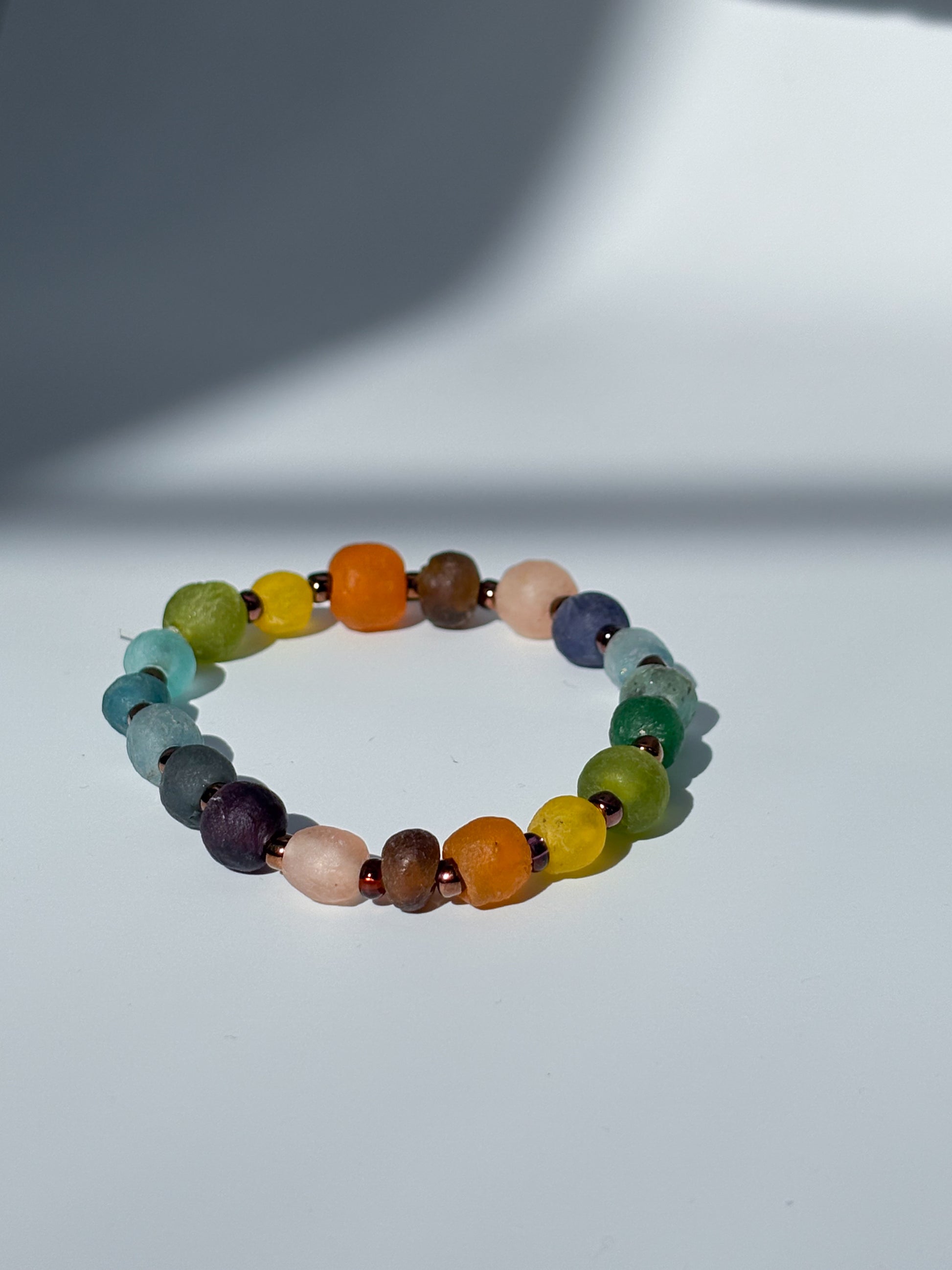 Handmade bracelet created with beautiful hand painted recycled glass and brass beads from Ghana.